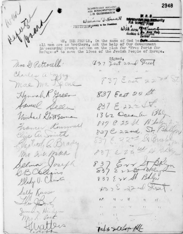 We, the people, in the name of God before whom all men are as brothers, ask the help of Our Government in securing prompt action on the plan for “Free Ports for Refugees” to save the lives of the Jewish People of Europe.
