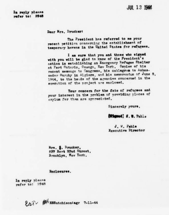 In January 1944, President Franklin D. Roosevelt created the War Refugee Board (WRB), after being convinced by a series of people, organizations and events. These sources of pressure included: Peter Bergson’s organizing and activism, the Gillette-Rogers Resolution, Breckinridge Long’s false testimony, and of course the “Report to the Secretary on the Acquiescence of this Government in the Murder of the Jews” developed by Treasury staff: Josiah DuBois, Randolph Paul and John Pehle. The WRB was tasked with “taking all possible measures to rescue and save the victims of enemy oppression, and to afford them all possible relief and assistance.”1 The WRB had contacts throughout Europe and worked with Ambassadors in London, Algiers, Spain, and with governments of allied and neutral nations to attempt to secure safety for refugees and other victims of Axis terror during World War II. In May, overpopulation of refugees in Southern Italy required that these refugees be moved elsewhere, and John Pehle and his staff at the WRB convinced the president to establish an Emergency Refugee Shelter at Fort Ontario, Oswego, New York, to house 1,000 refugees until the termination of the war (actual number rescued: 982).