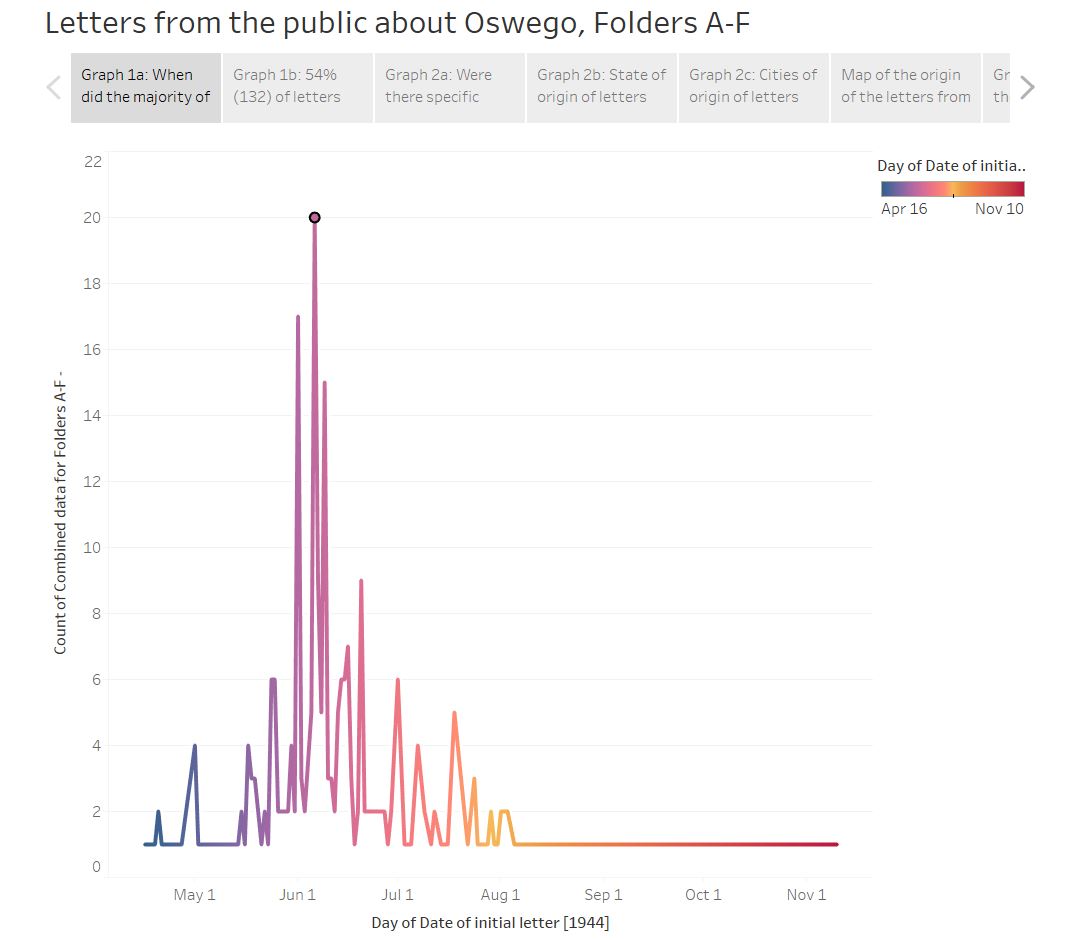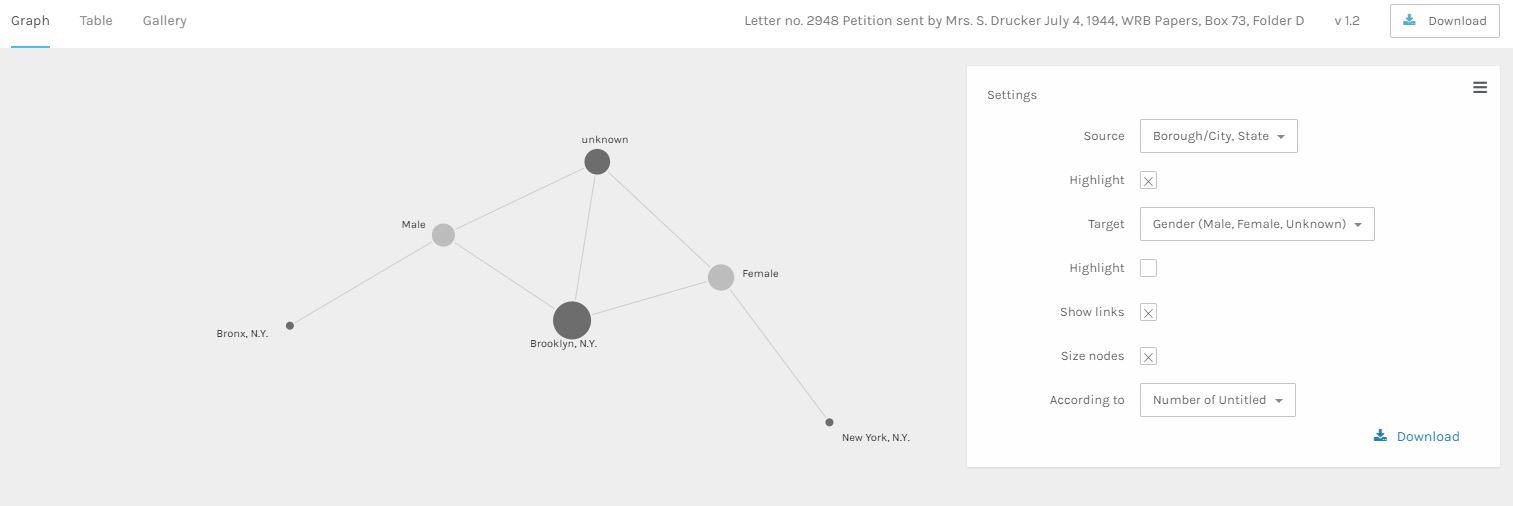 This petition was found within the War Refugee Board Papers, Series 4, Box 73, Folder D, no. 32 in the file. The data set explored here with graphs and visualizations (made using Tableau public and Palladio) covers Boxes 73-74, the A, B, C, D, E, and F folders (a total of 8 folders and 244 cases). The digital versions of these folders can be found via the “Selected Digitized Documents related to the Holocaust and Refugees” in the FDR library’s Franklin database. The relevant folders begin with the title “Records of the War Refugee Board – Admission of Refugees into the U.S.” The letters were sent from April through November of 1944. Replies were sent by John Pehle, Director of the War Refugee Board, from May through November.