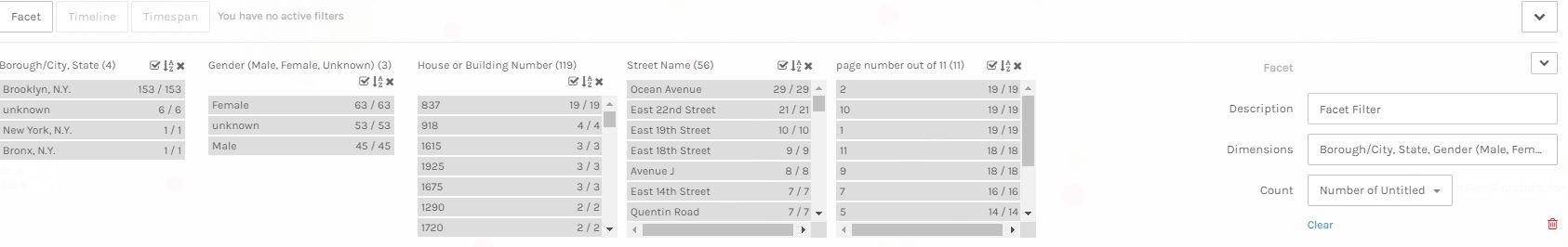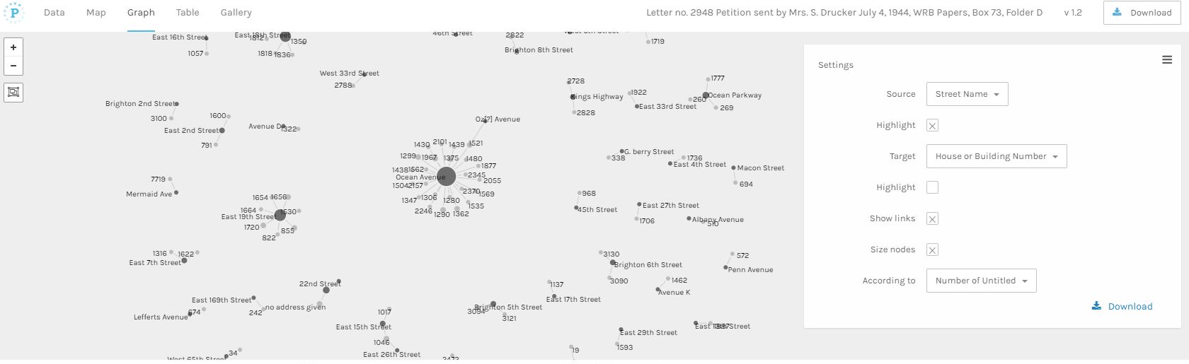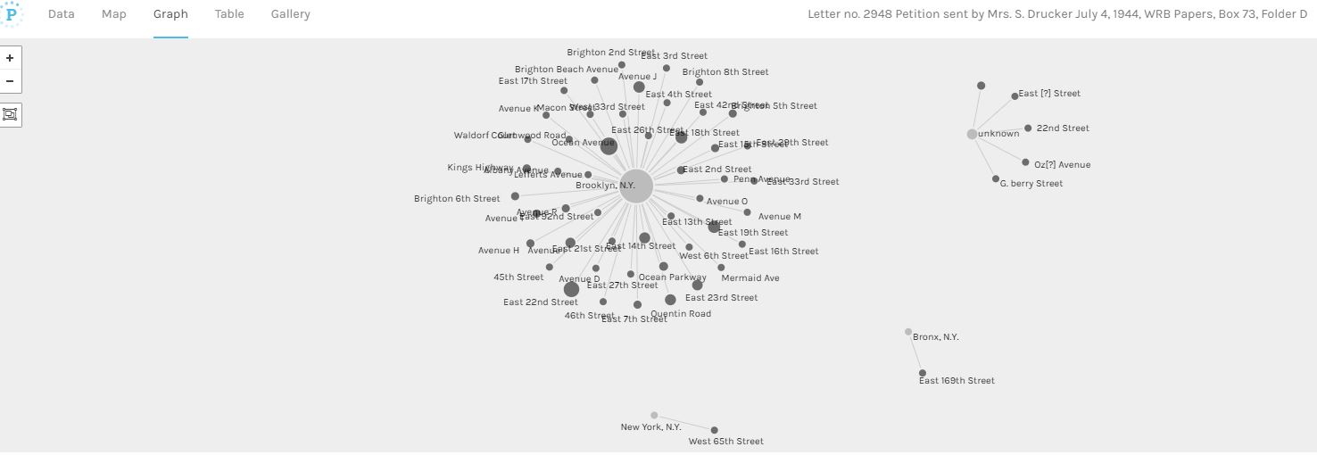 I converted this excel sheet to a .csv file so that the info could be imported into Palladio. This excel sheet contains all the original columns I created based upon the information presented in the petition. There are two sheets in this excel file. The second sheet (tab) contains a key which explains the letter codes the provide the reason why I assigned Brooklyn as the borough in the case that it was not explicitly written by the signatory.