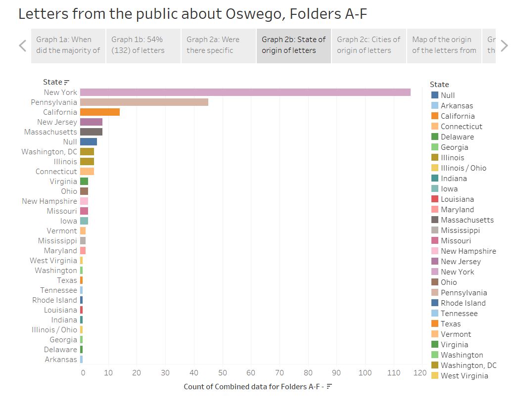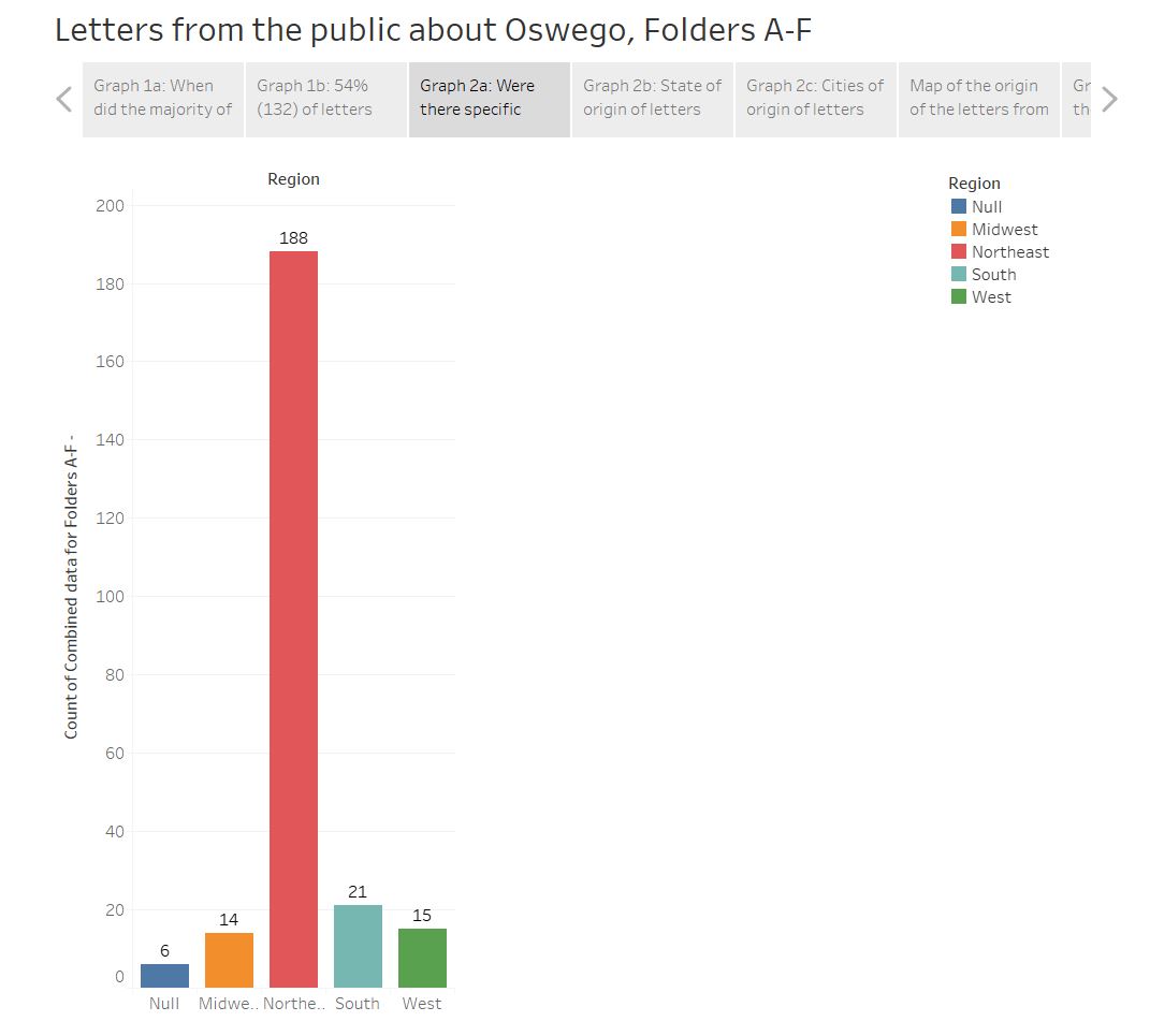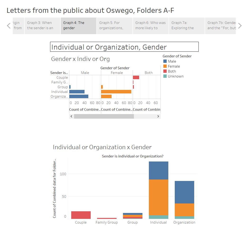 Graph 4: Overall there were more female senders (107 female senders versus 90 male senders). Women sent 66% of the letters from individuals, but only 35% of the letters from organizations. For individuals, it was twice as likely that the sender would be female (79 female v. 40 male). For organizational senders, 64% of the time the sender was male (50/78).