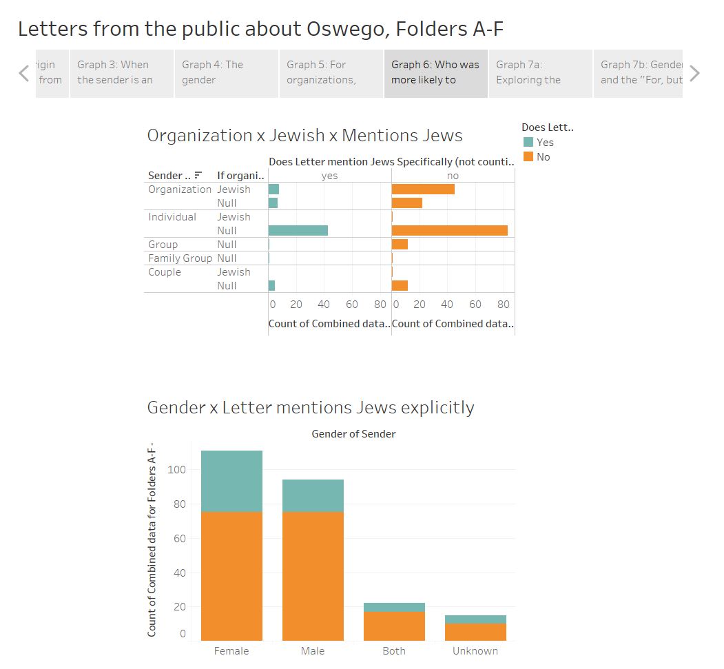 Graph 6: Individual senders made up 66% of all letters which explicitly mentioned Jews (43/65). Thus, if a letter mentioned Jews it was much more likely that it was from an individual than from an organization or a couple or group. Women were more likely than men to explicitly mention Jews in the text of their letters. 32% of female senders mentioned Jews (36/111), while only 20% of male senders did (19/94). 55% of mentions of Jews were in letters written by women. Males made up 29% of letters which mentioned Jews.